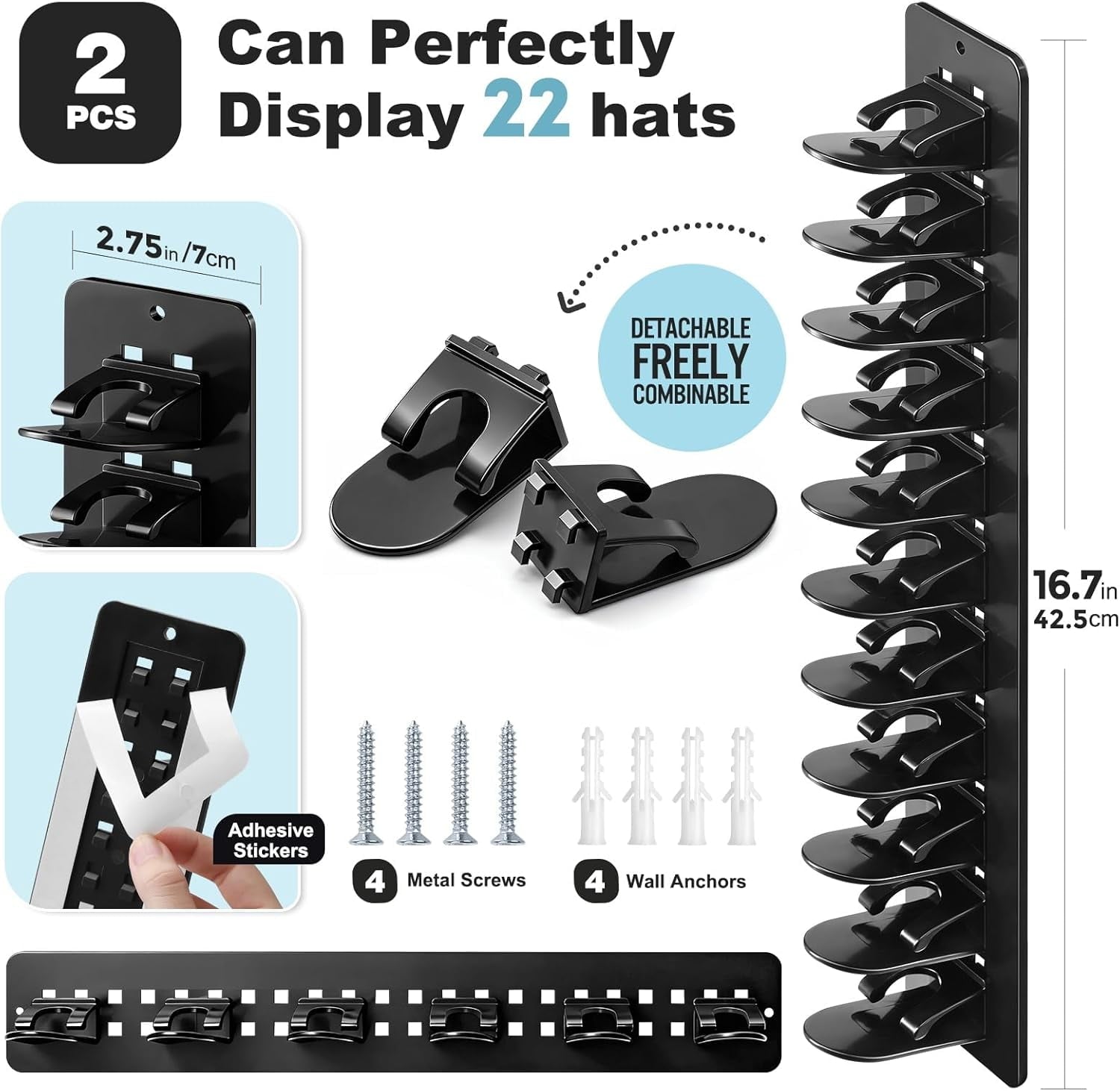 Livhil 2 Pack Hat Organizer for Baseball Caps, Detachable DIY Hat Rack Hold up to 22 Hats, Hat Holder for Wall Closet Door Bedroom (C-Black)