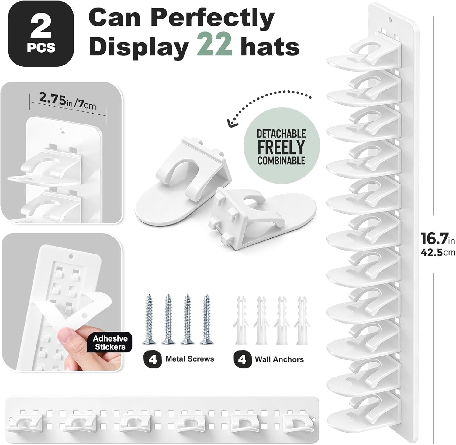 - Dimension Capacity: The hat organizer for baseball caps is constructed from sturdy ABS plastic, with overall dimensions of 2.7 × 16.7 inches, and can hold up to 22 hats.