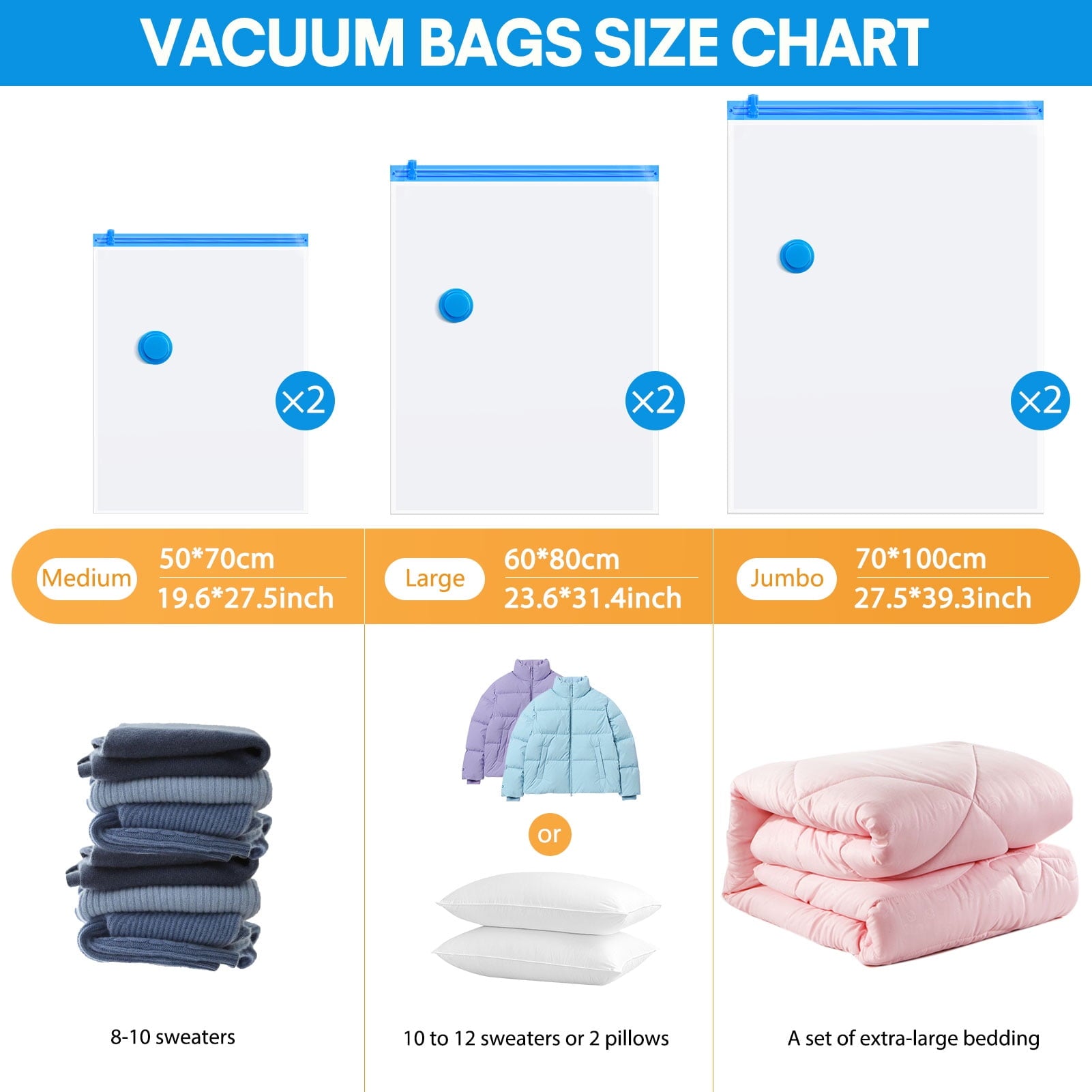 Includes 2 jumbo (27.6 x 39.4 inches) 2 large (23.6 x 31.5 inches) and 2 medium (19.7 x 27.6 inches) vacuum storage bags with 1 hand pump ideal for mixed storage needs -