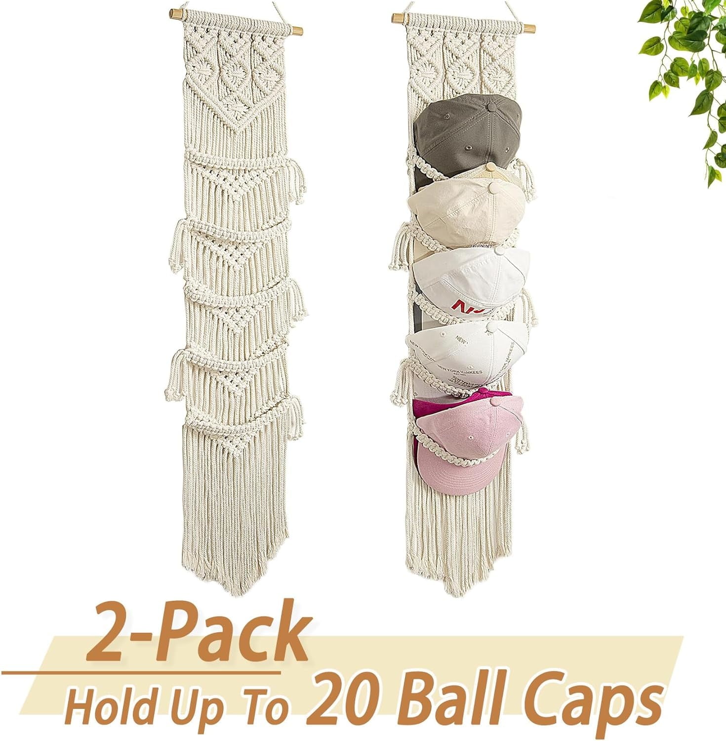 Livhil hat organizer for baseball caps is made of cotton thread and pine wood, soft texture, not easy to break or fade, can be used for a long time. Handmade woven rope and decorative tassels brings a bohemian style to the hat hanger organizer, make it simple and elegant. Livhil baseball hat organizer features a single hook design with 8 compartments that hold 24 hats or more, and can be hung in numerous spaces such as behind doors, inside or outside closets, on walls—providing utmost flexibility across various environments and spaces. Not only is it a great way to organize pretty hats, but it's also a unique boho wall decoration.
