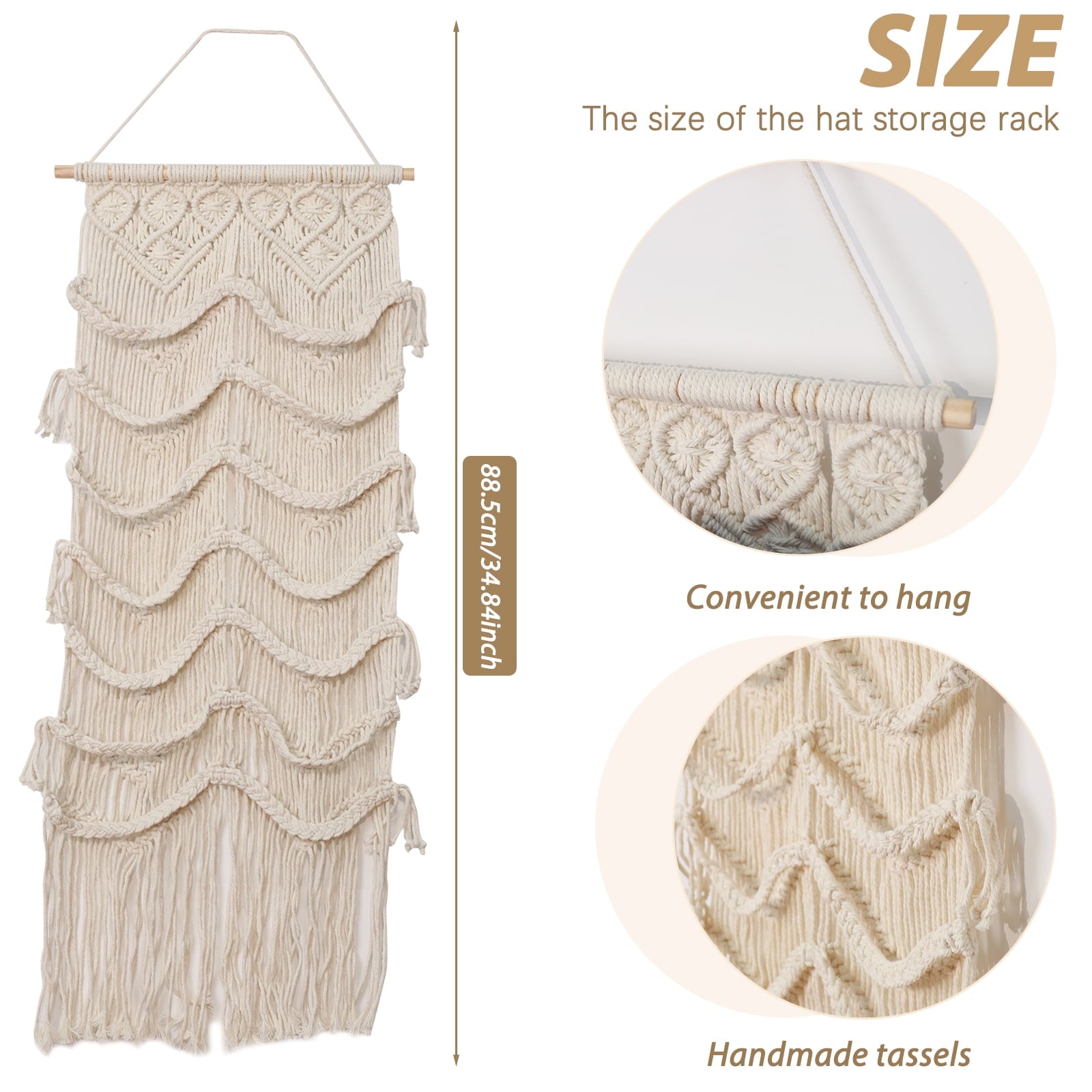 Livhil double row woven macrame hat hanger, inspired by bohemian style, combines the beauty of wall decoration with storage function, bringing a burst of artistry to your space, owning it will be a decision you won't regret!