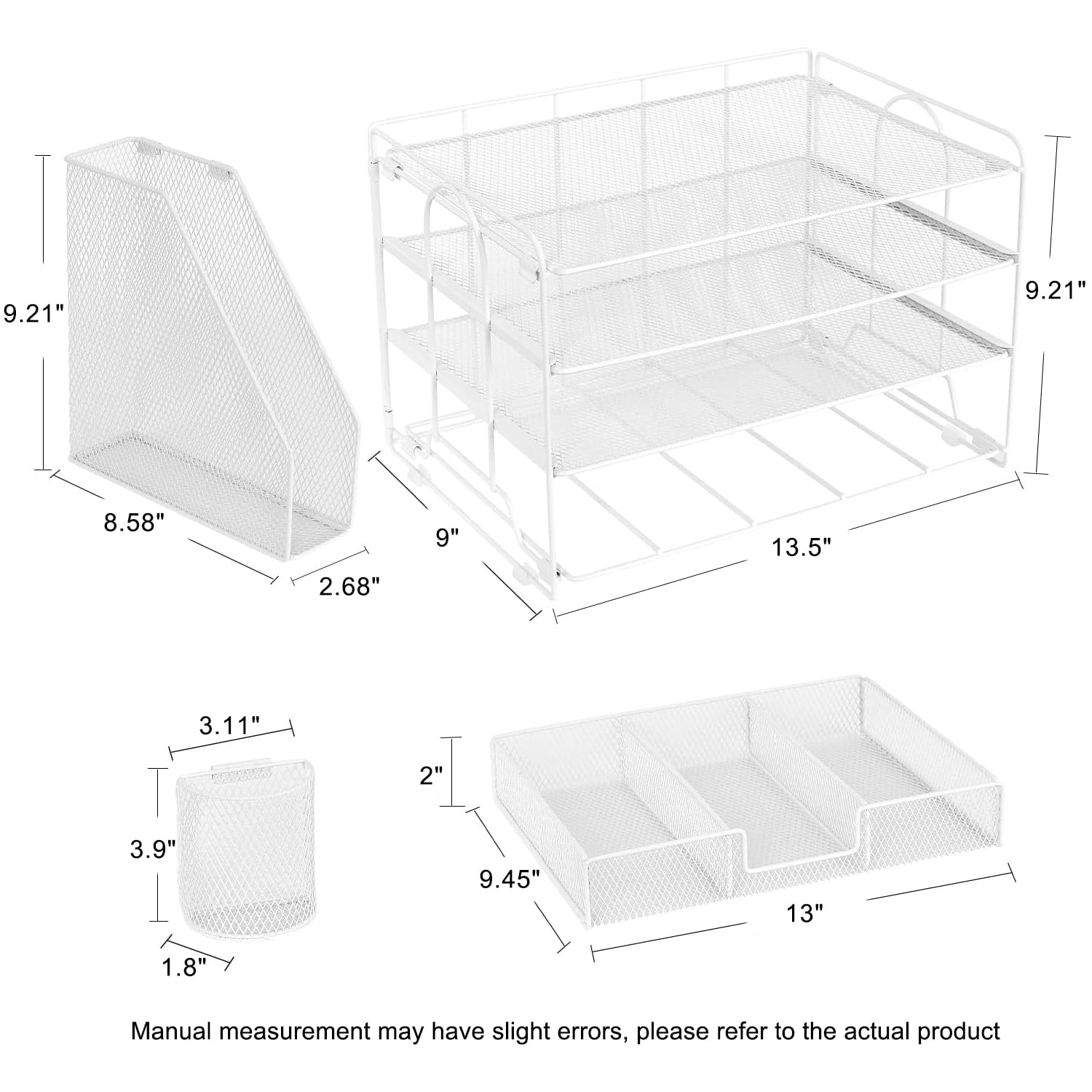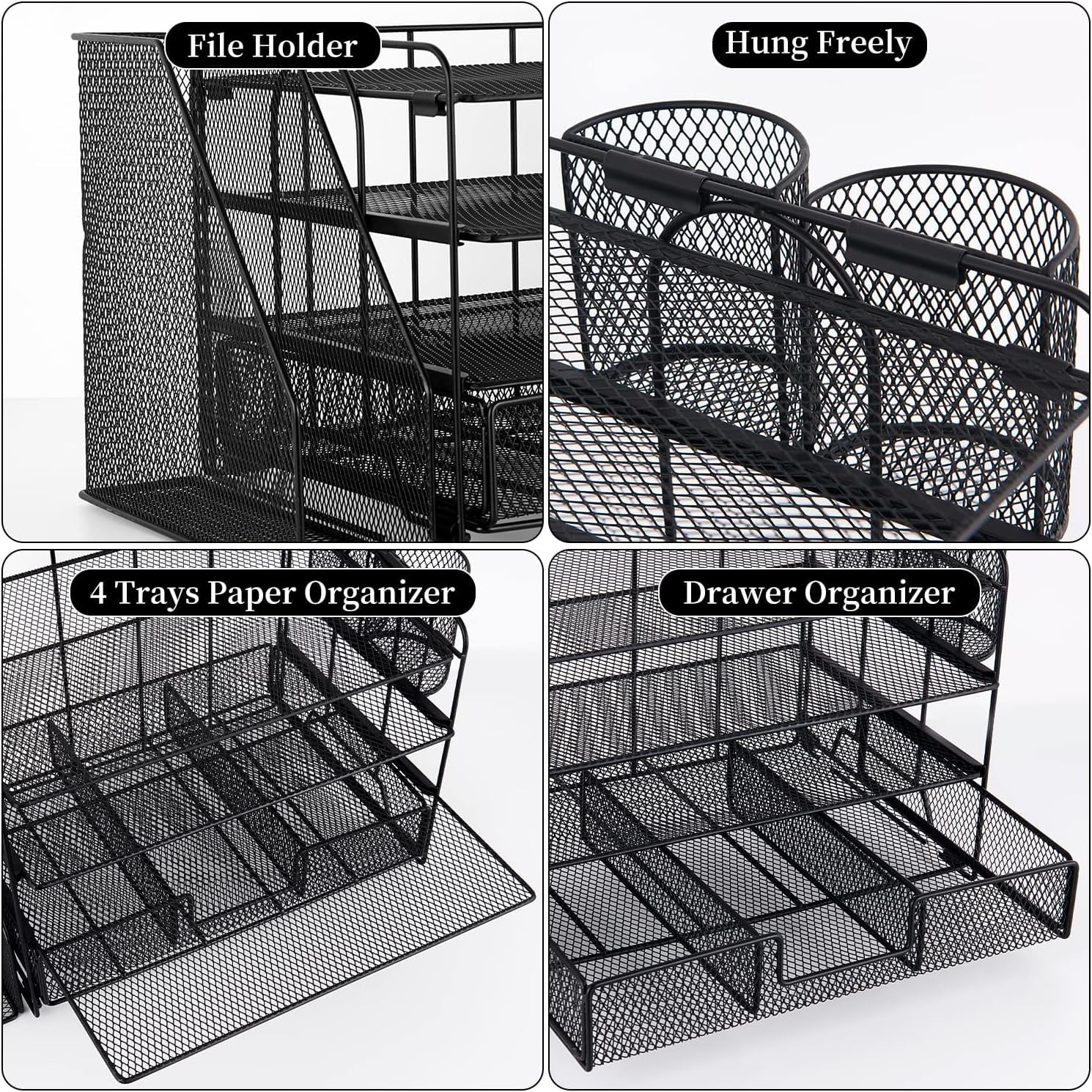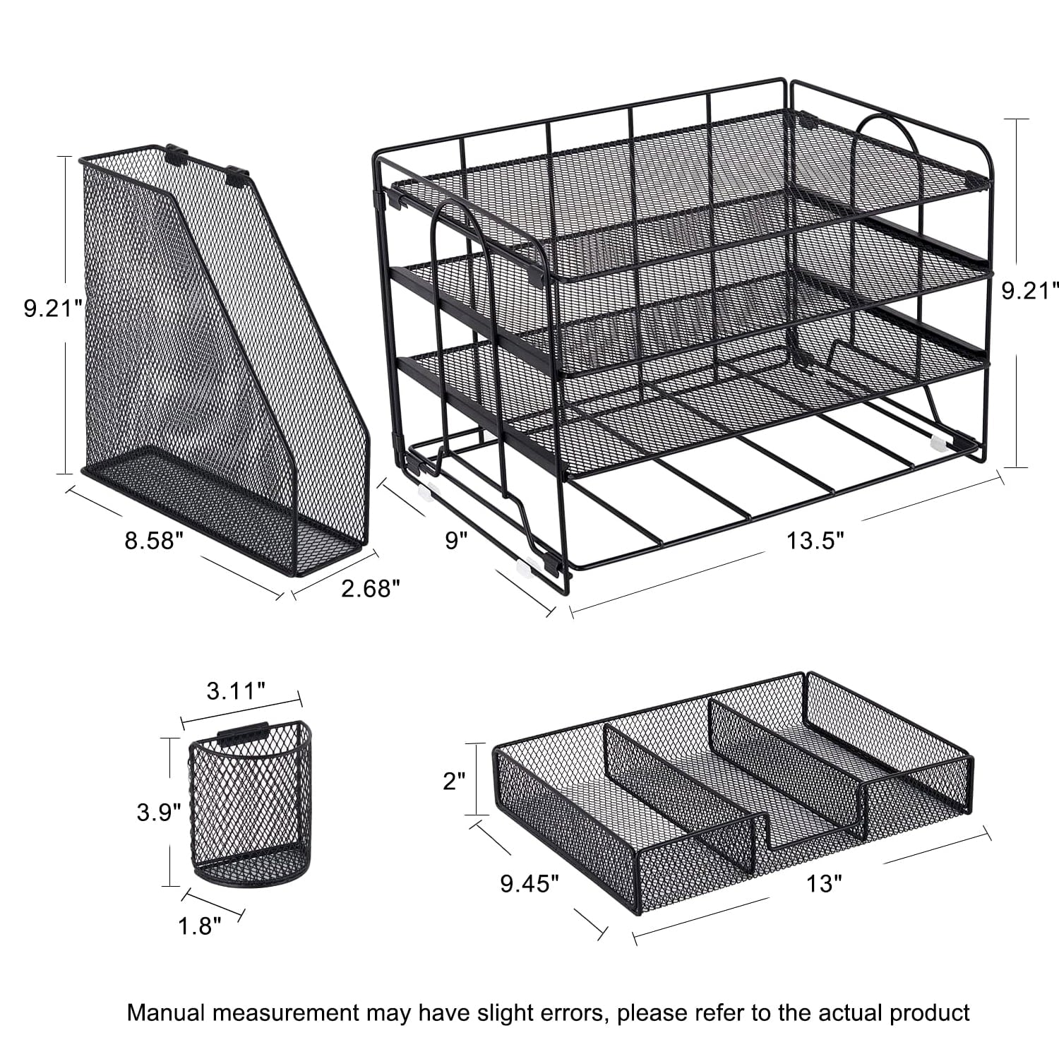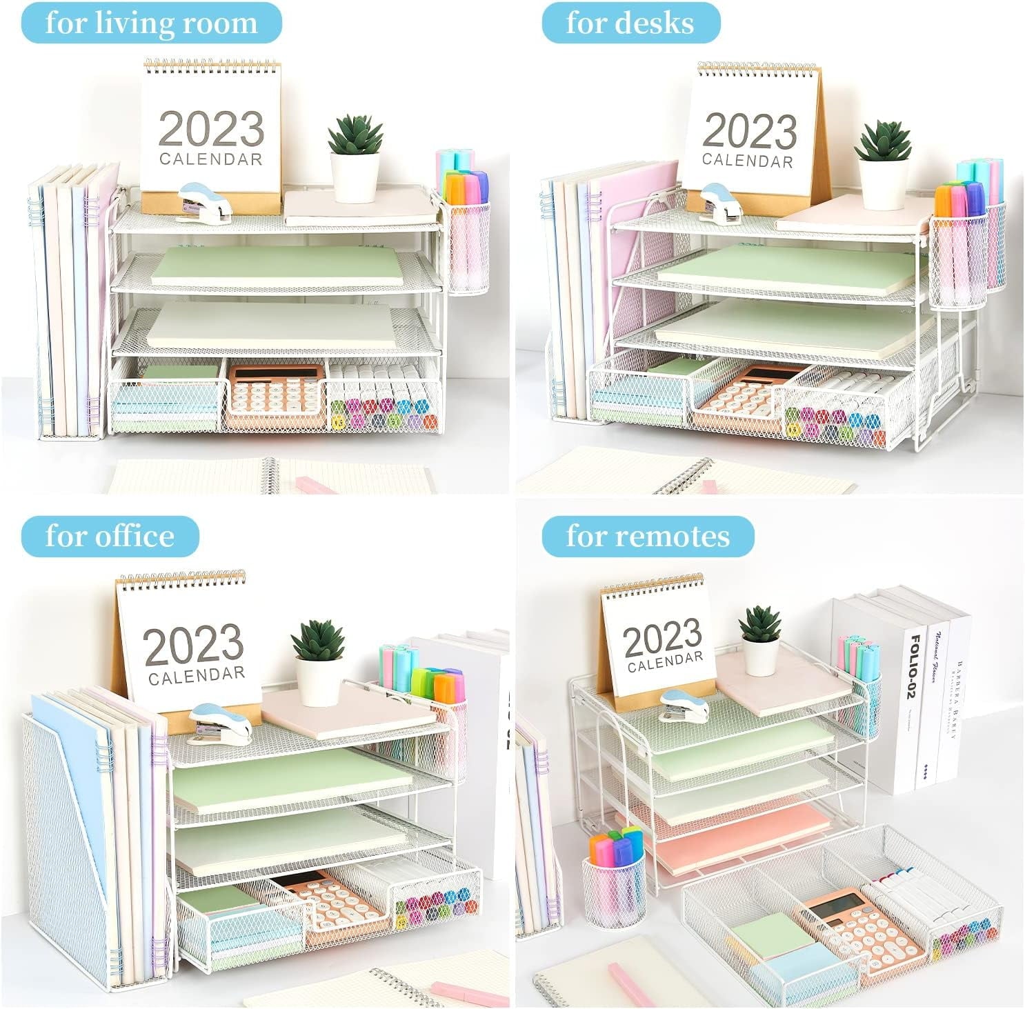 The office desk organizers clearance fully utilizes the vertical space of the desktop, creates the largest possible storage space, accommodates various office desk accessories, and saves space. The file folder organizer includes 4 trays, a magazine rack, 2 pen holders and a sliding drawer, helps you quickly identify the contents of each compartment, doubles your work speed, keeps you busy and more creative throughout the day. The desk file organizer is made of durable metal mesh and solid steel, which has better stability and durability, and the outer layer is epoxy coated, which is rust-resistant and highly durable, ensuring a long service life.