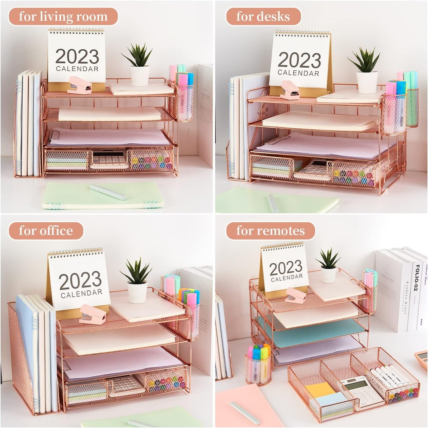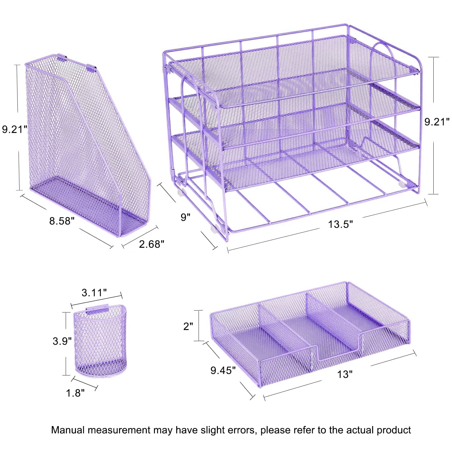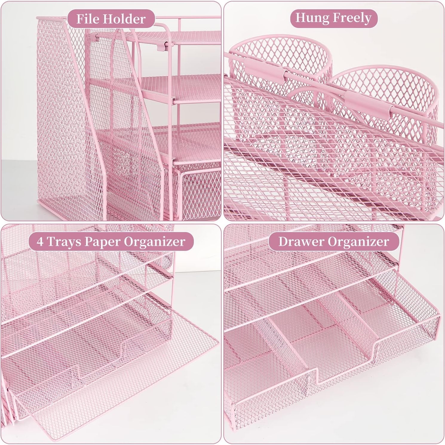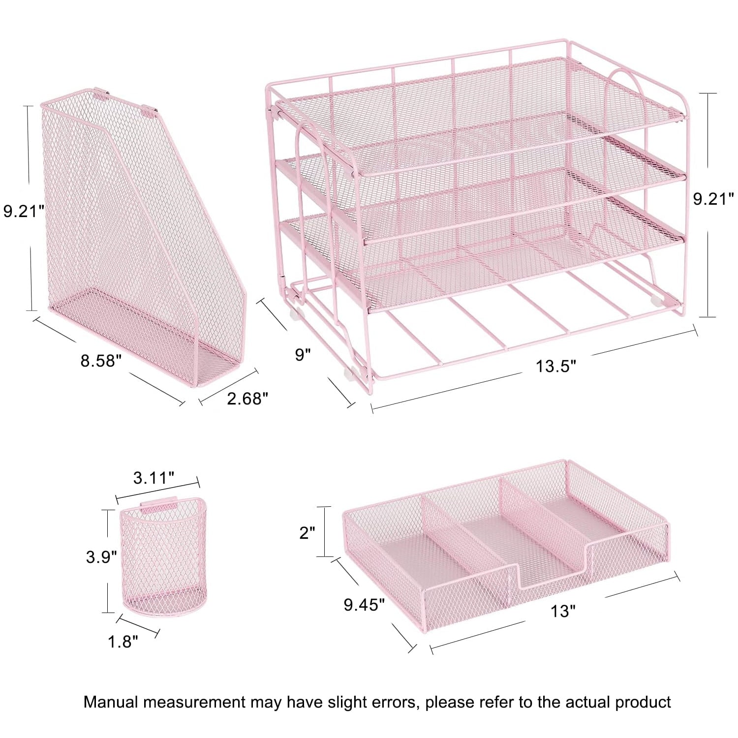 The office desk organizers clearance fully utilizes the vertical space of the desktop, creates the largest possible storage space, accommodates various office desk accessories, and saves space. The file folder organizer includes 4 trays, a magazine rack, 2 pen holders and a sliding drawer, helps you quickly identify the contents of each compartment, doubles your work speed, keeps you busy and more creative throughout the day. The desk file organizer is made of durable metal mesh and solid steel, which has better stability and durability, and the outer layer is epoxy coated, which is rust-resistant and highly durable, ensuring a long service life.