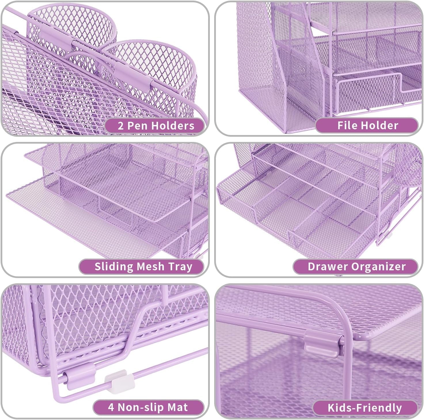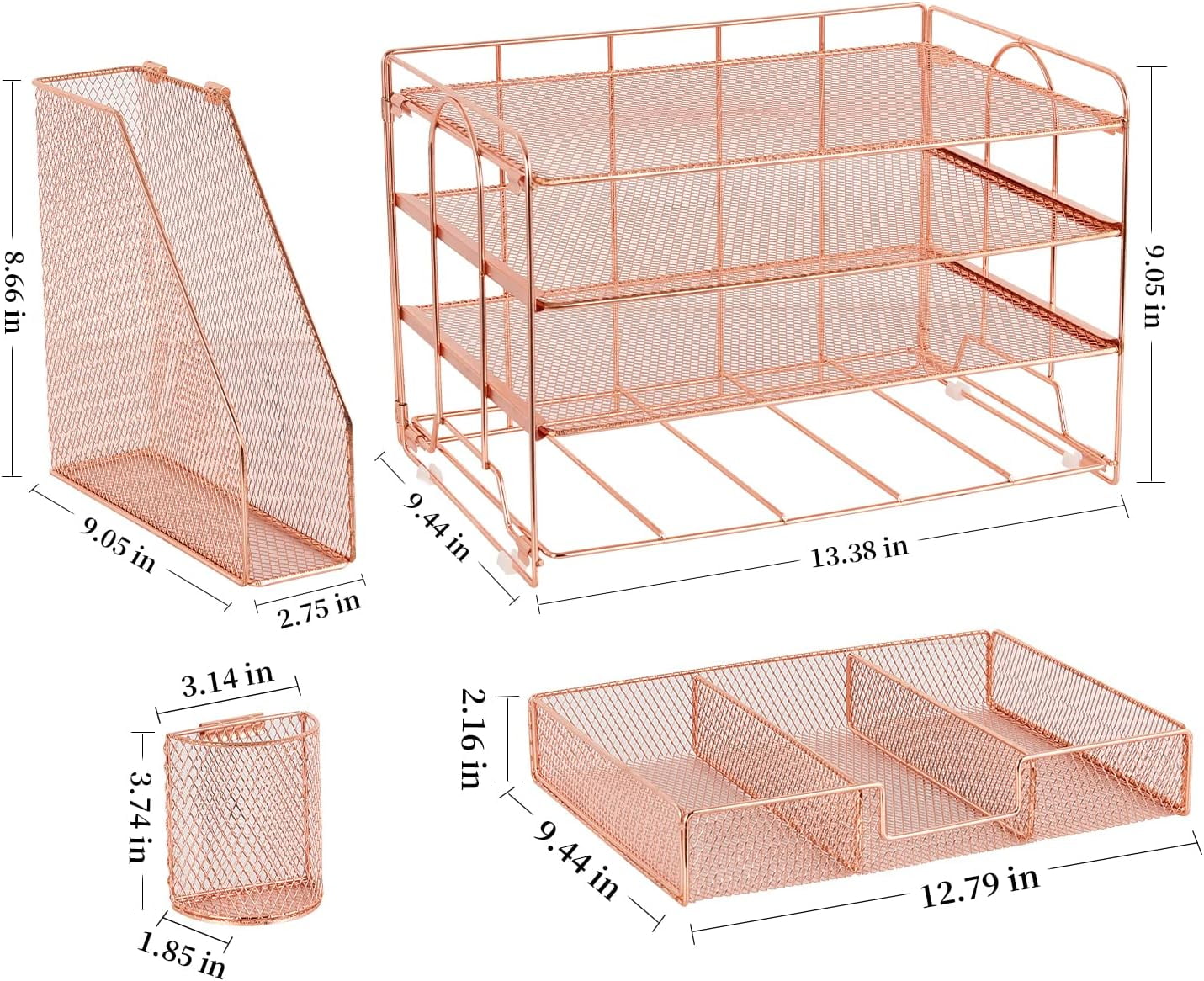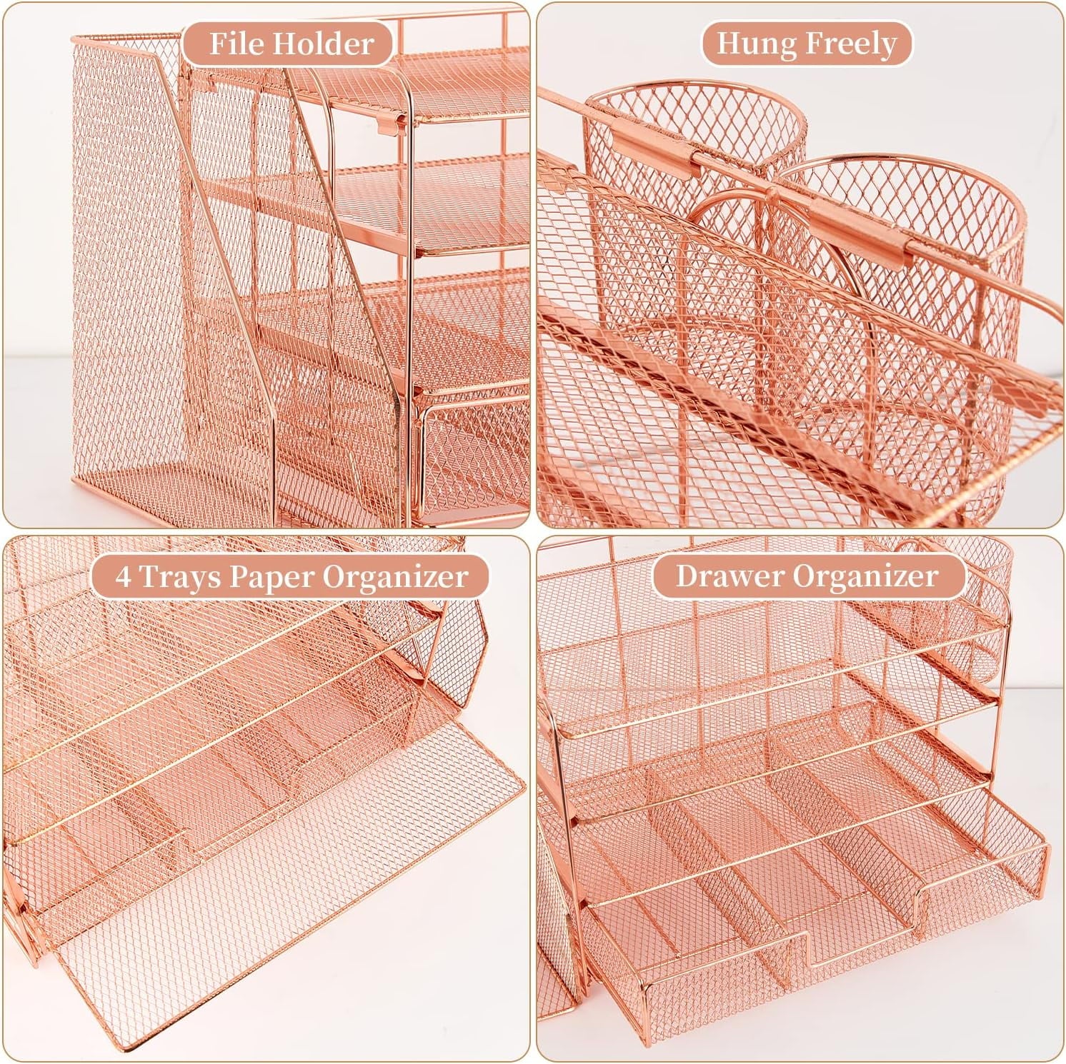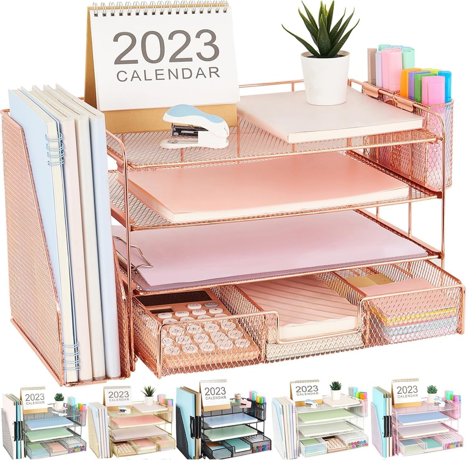 The office desk organizers clearance fully utilizes the vertical space of the desktop, creates the largest possible storage space, accommodates various office desk accessories, and saves space. The file folder organizer includes 4 trays, a magazine rack, 2 pen holders and a sliding drawer, helps you quickly identify the contents of each compartment, doubles your work speed, keeps you busy and more creative throughout the day. The desk file organizer is made of durable metal mesh and solid steel, which has better stability and durability, and the outer layer is epoxy coated, which is rust-resistant and highly durable, ensuring a long service life.
