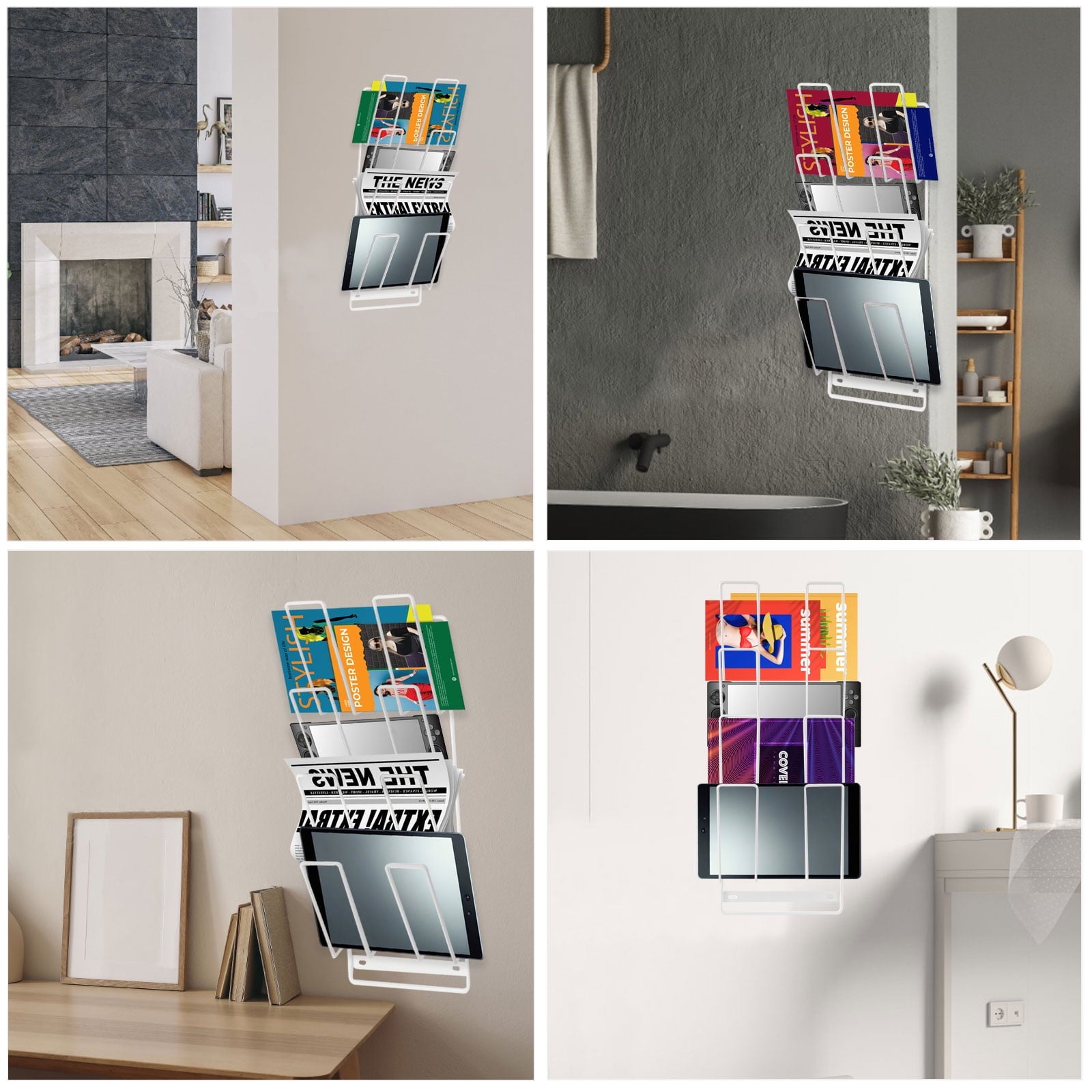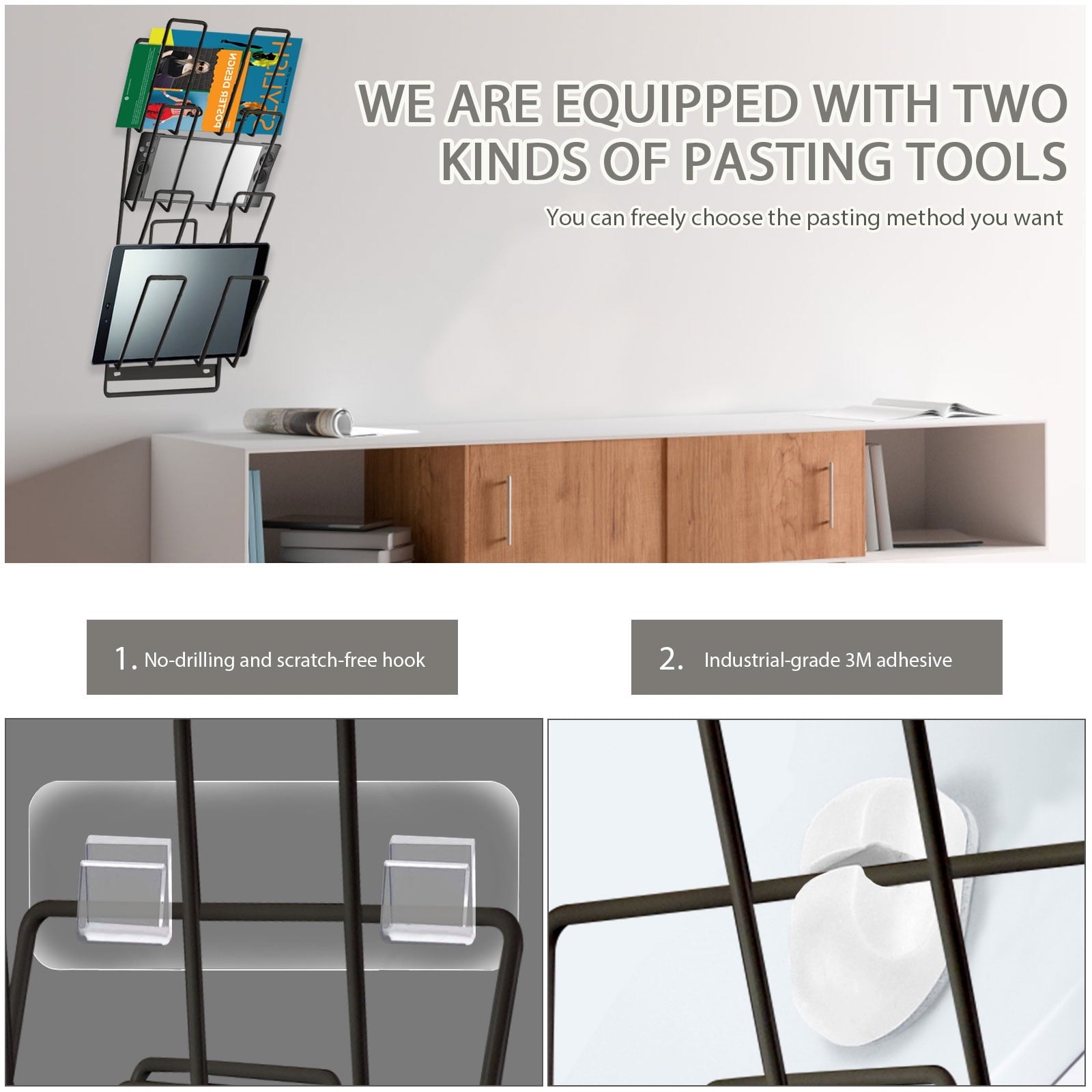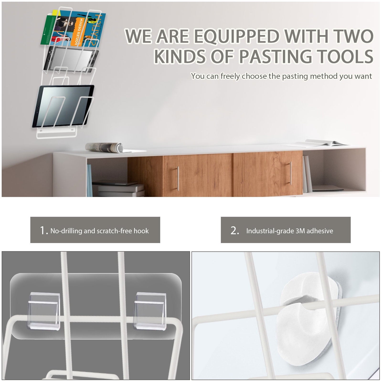 Comes with strong adhesive strips and clear wall hooks for flexible, tool-free mounting. No drilling required—just peel and stick. Strong enough to support your tablets, magazines, or handheld gaming consoles anywhere
