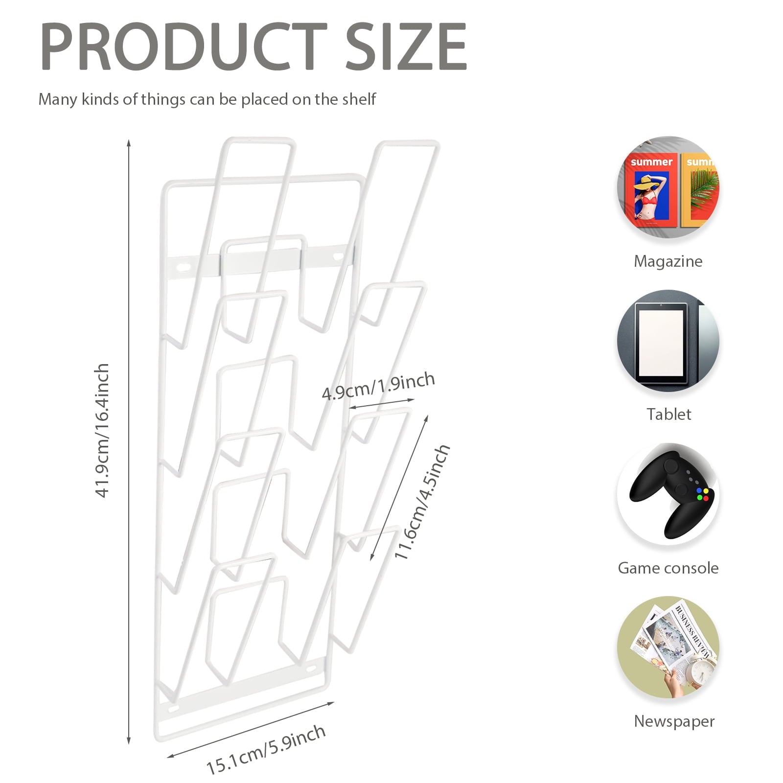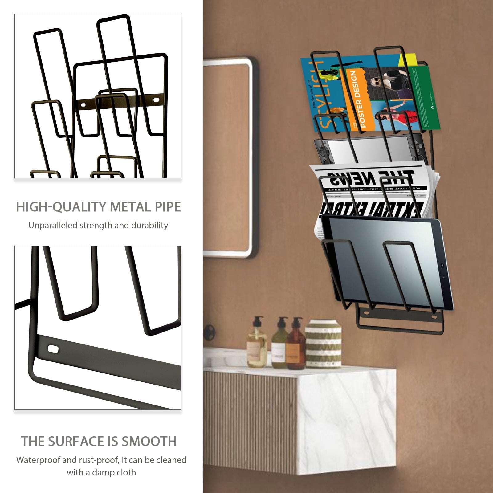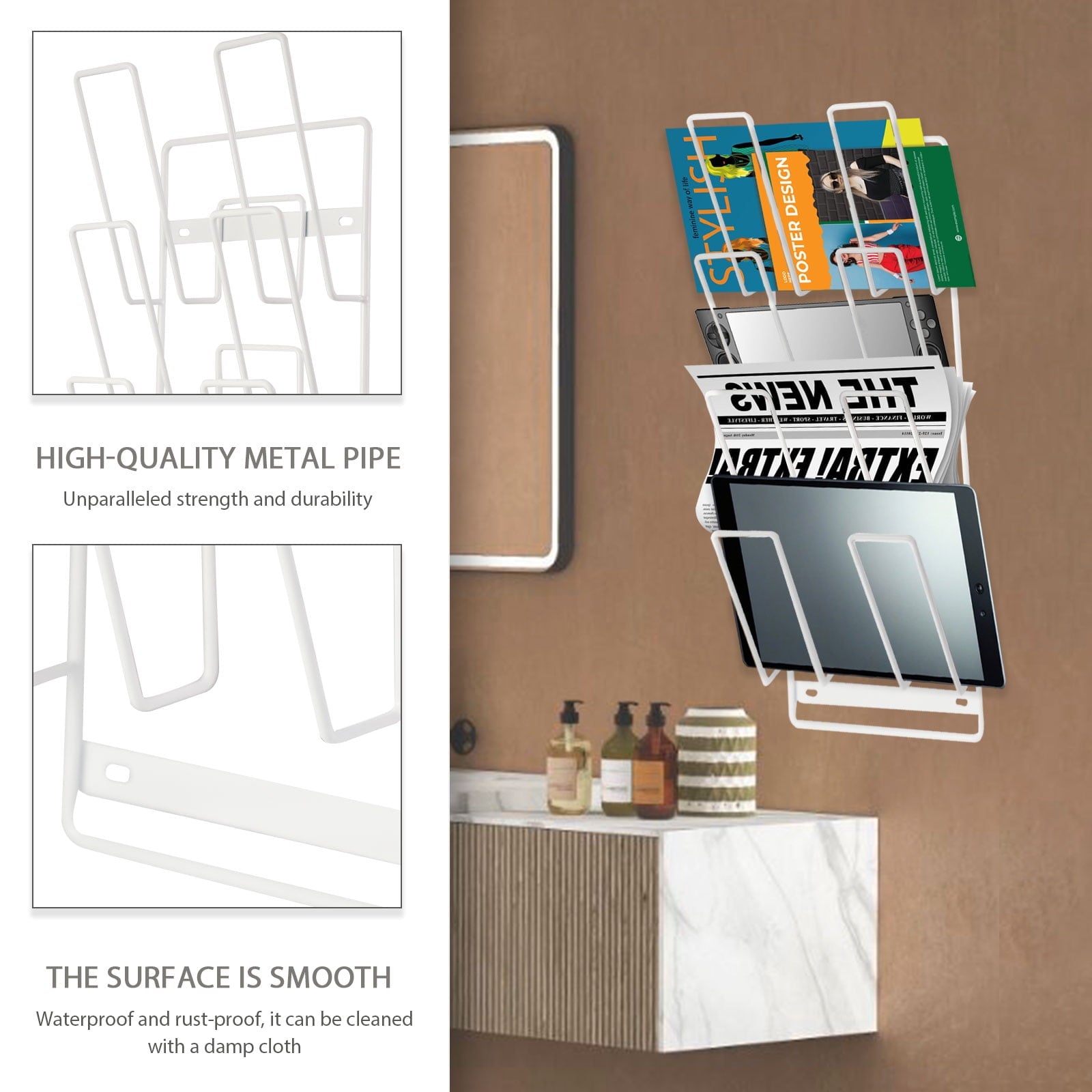 Comes with strong adhesive strips and clear wall hooks for flexible, tool-free mounting. No drilling required—just peel and stick. Strong enough to support your tablets, magazines, or handheld gaming consoles anywhere