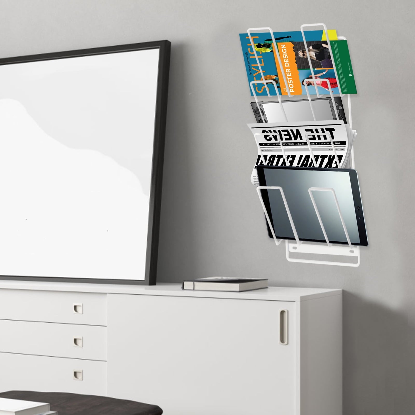 This wall-mounted device organizer features 4 open tiers, providing a compact and efficient way to organize your tech gear. It’s ideal for storing tablets, iPads, slim laptops, game consoles, and more—making it a versatile tablet storage rack for your tech-filled home or office -