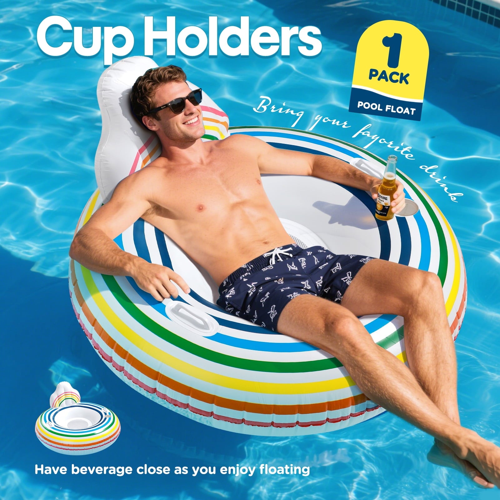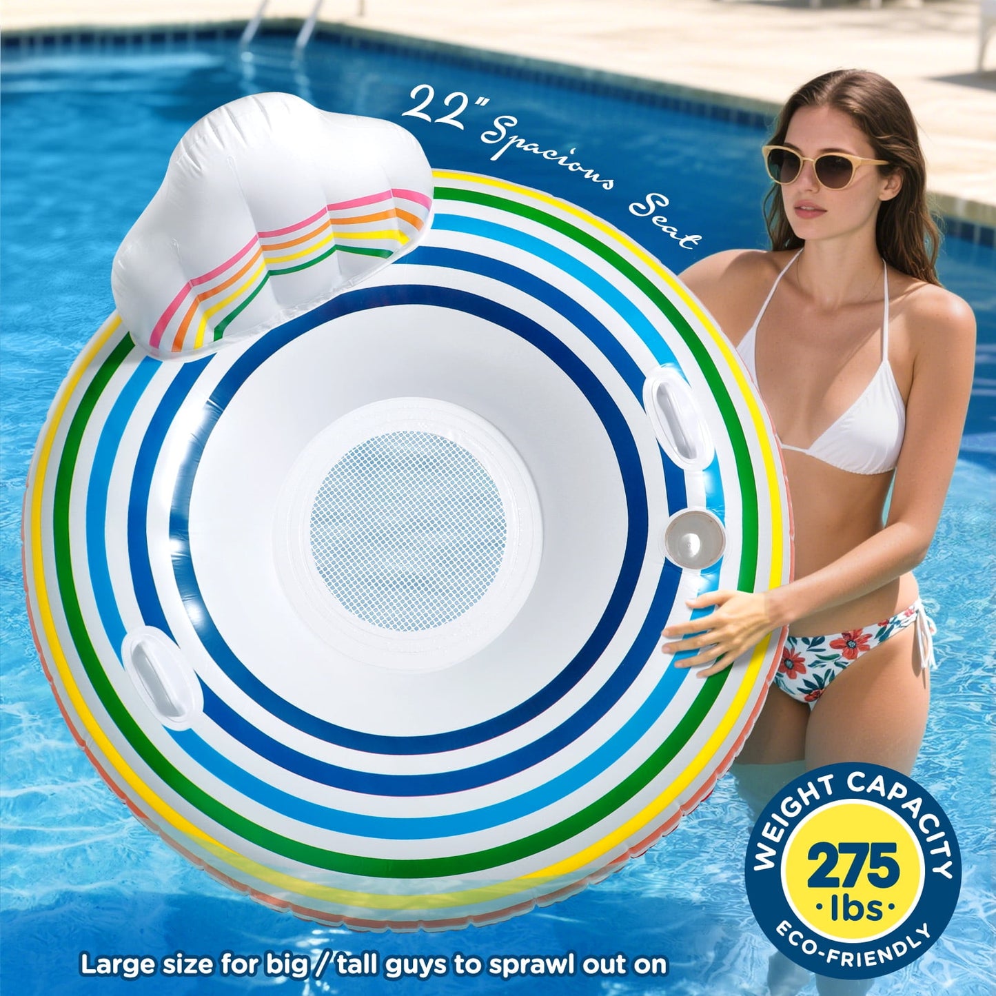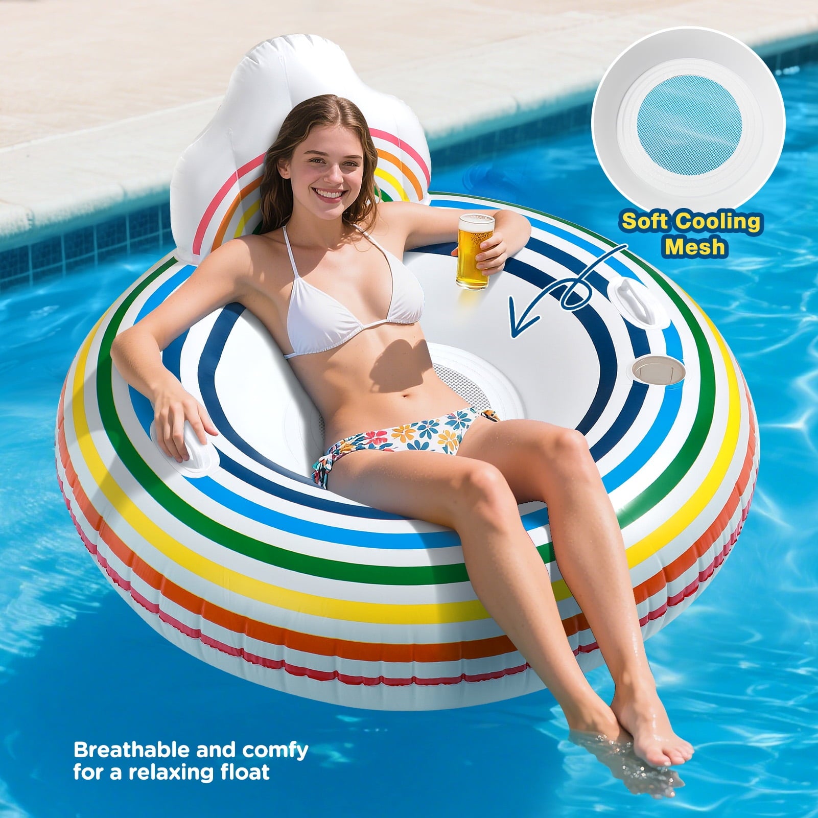 Livhil Inflatable Pool Float Lounger - River Tube Floating Chair Sofa with Backrest, Pool Float Chiar with Mesh Bottom Handle Cup Holder Pool Party Toys for Adults (White Rainbow)