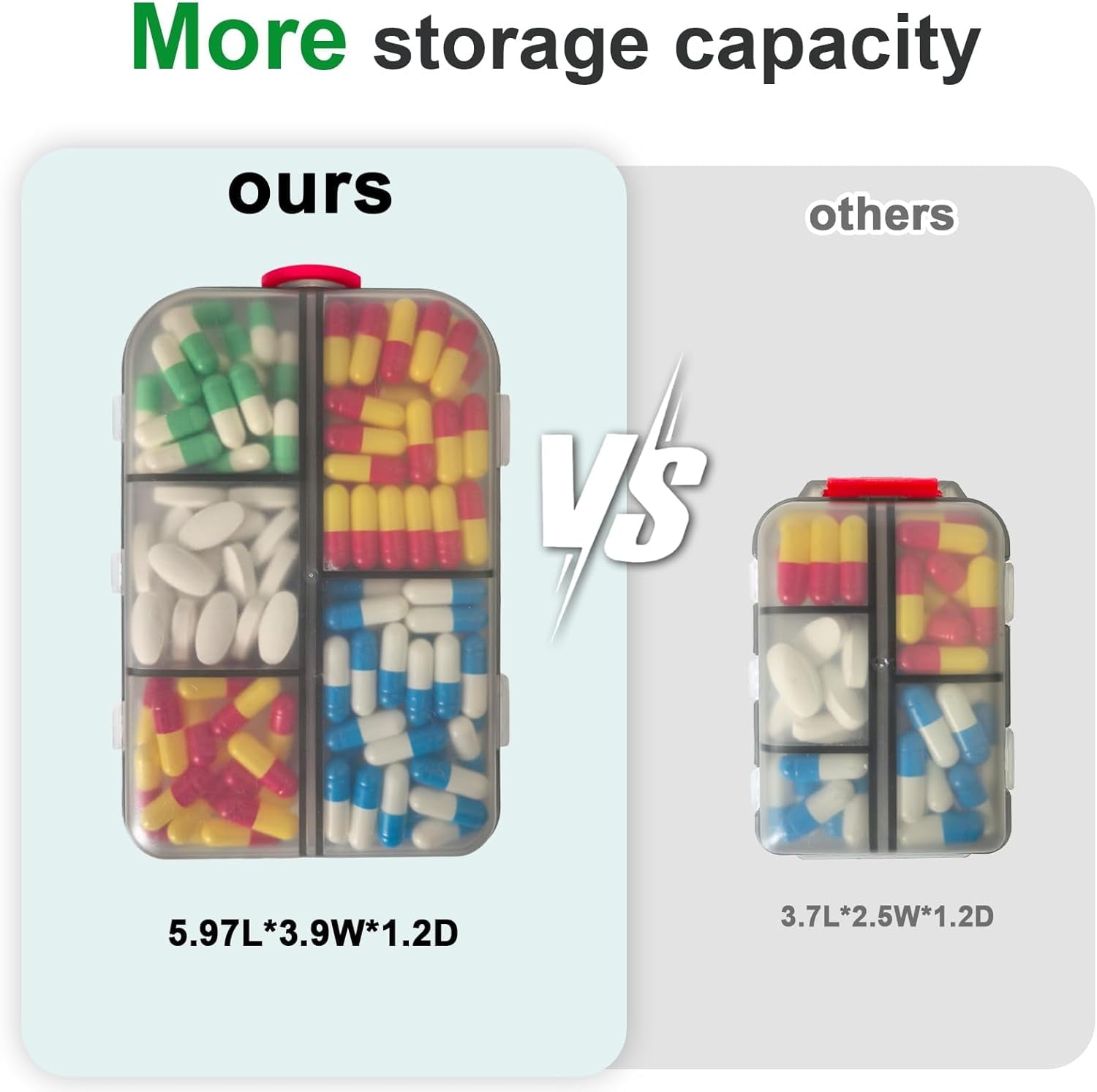 - Ample Storage Space: With 10 compartments (6 for smaller pills and 4 for larger vitamins) and a compact size of 5.97" x 3.9" x 1.08", this large capacity medicine organizer is the perfect travel companion for your daily pill regimen. It has been redesigned for more storage and is the perfect travel companion for your daily medications.