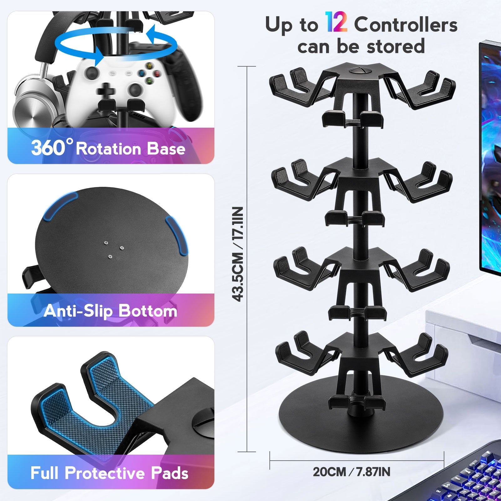 With 12 stowable positions, the swivel stand perfectly organizes and displays your controllers.