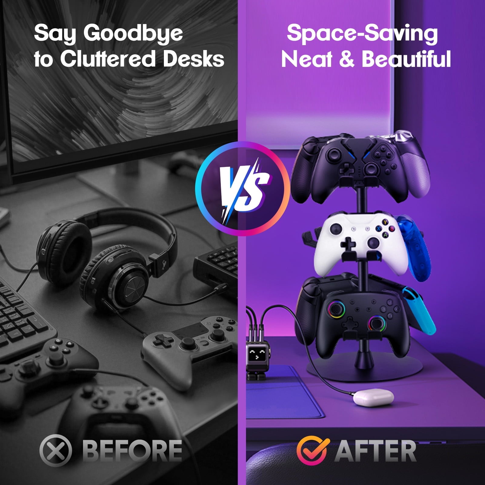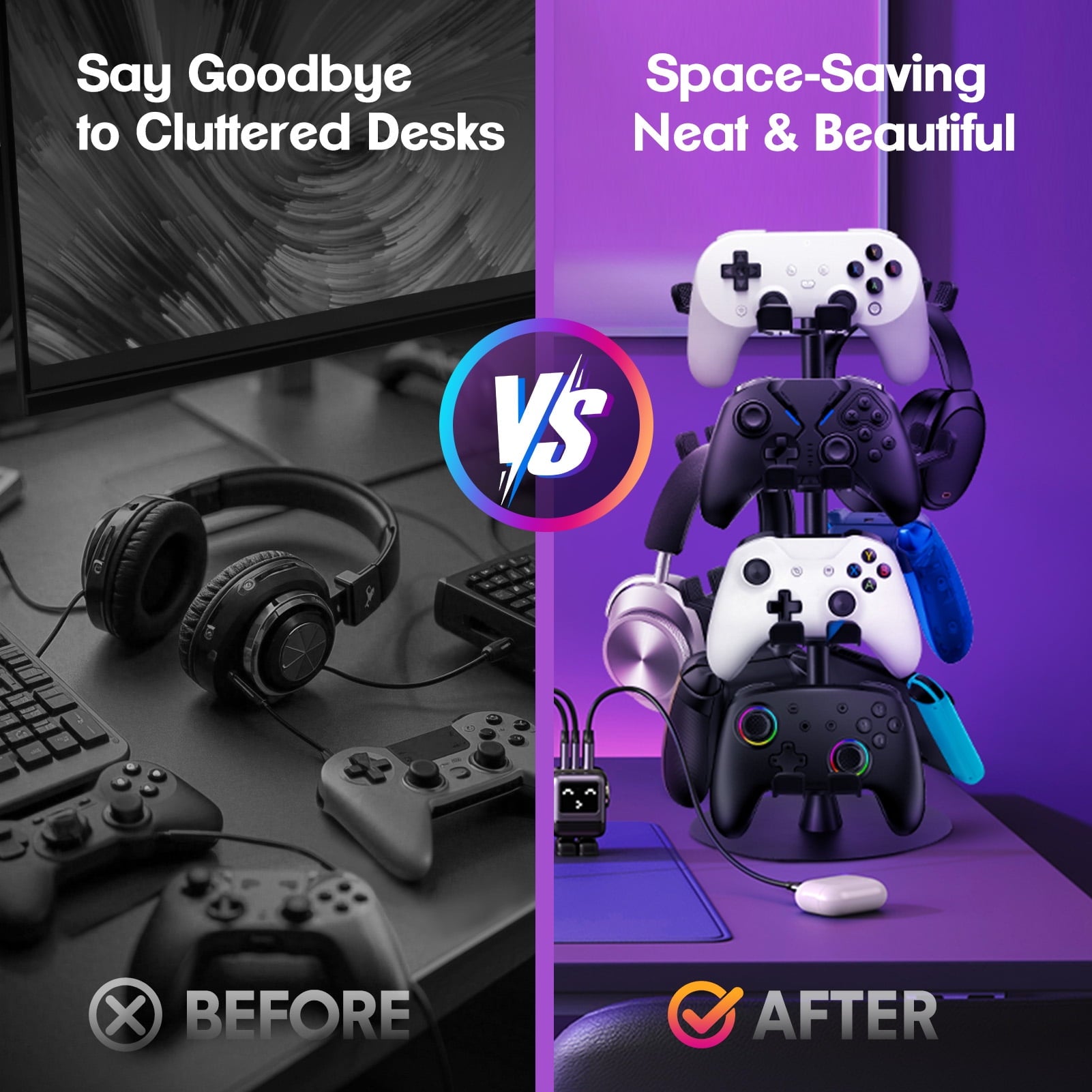 - SPACE SAVING: Vertical storage makes this controller headset stand stylish and beautiful, maximizing the use of space. This table stand is perfect for storing or displaying all your game controllers and headset models, keeping your gaming area neat and organized.