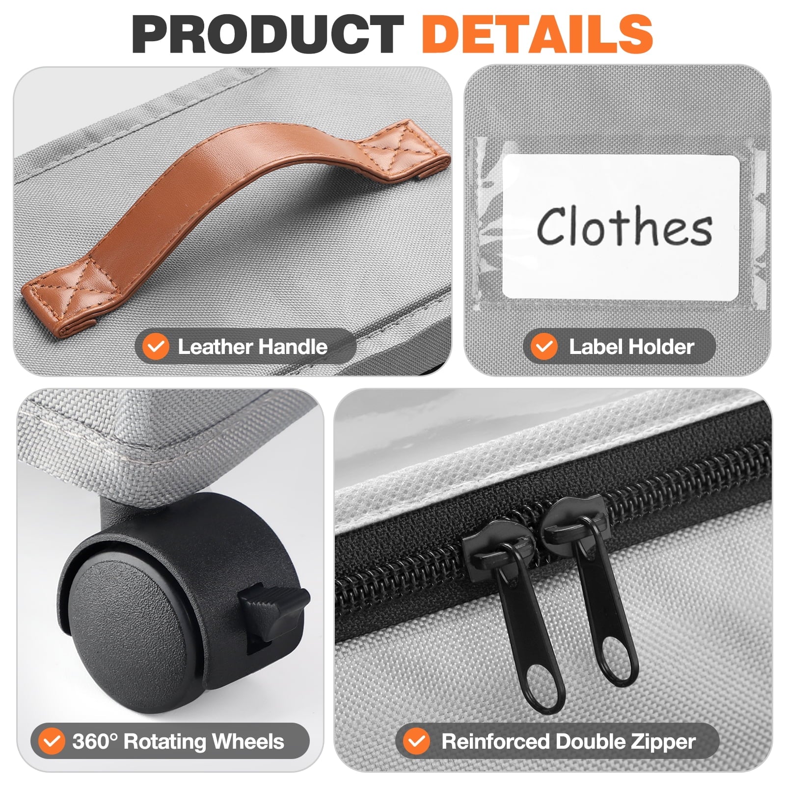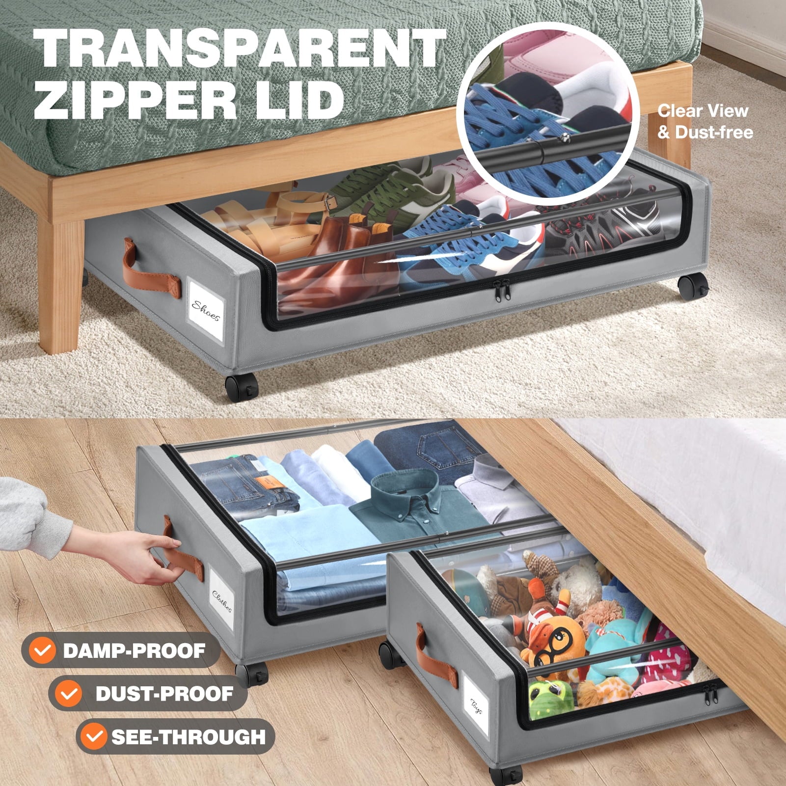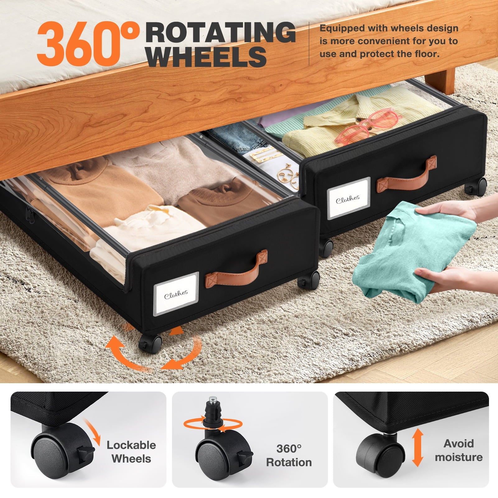 Turn the space under your bed into convenient storage space with the Livhil Under bed Zippered Storage Bin Say goodbye to constantly carrying heavy storage boxes around your house.This under bed rolling storage comes with 4 x 360°rotating wheels, two of which have locking function.When you need it to remain stationary, just press the locking mechanism gently. No matter how full the cart is, adults and children can easily slide on the floor and carpet.