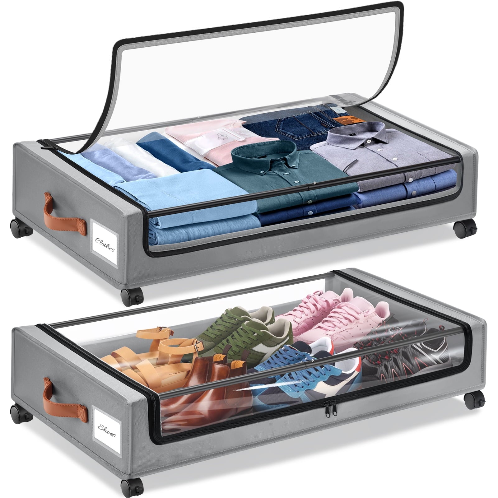 This under bed storage on wheels makes it easy to keep items stored and out of the way in virtually any bedroom. Crafted of durable gray fabric, this storage and organization has a clear top to easily identify contents and a zipper closure. Two side handles and wheels make sliding the bin in and out from under the bed easy therefore the Livhil underbed zippered storage bin with wheels is a great way to store shoes, sweaters, out-of-season clothing.